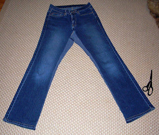 I started by cutting the inseam out of my comfiest pair of jeans. After I started cutting, I freaked out a little, thinking I don't have a pattern... I don't know what I'm doing... I don't even have a real plan yet... I am so glad it all turned out okay, or I would be down a pair of good jeans.