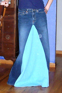 Next, I started cutting up a cotton/poly bedspread that my grandmother gave me (along with the trundle bed that it has been living on for the last 30+ years), to fill in the middle of my soon-to-be skirt. It was all very trial and error. The crotch parts were difficult to sew properly. I'm sure there is a good method for that, and I hope to figure it out some day... I didn't alter the hem of the jeans--just matched the bedspread fabric to go along with it. I am realising that it will drag far too much, so I will be rehemming in the near future.As far as the Sew What?!! sew-along goes, it is a joint effort between The Sewing Dork and her Canadian friend. I am a little unclear on the rules, so I'm not sure how well I did this week... I think I was supposed to make a skirt out of denim and one other fabric. I don't know what next week's challenge is going to be, but I am going to try to continue using bits of this bedspread throughout the month. We'll see if that works out.