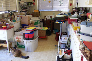 Slowly, but surely.... Once I got going, there was no stopping me. Yesterday afternoon and this morning, I had a bit of child-free time to work on the grand mess I call a craft room. I pulled EVERYTHING out of there and then only brought back things that had a place to call home. I will confess, there is still a stack of papers that I need to sort through. Though I know most of it will be recycled, some are valid papers that need to be filed.