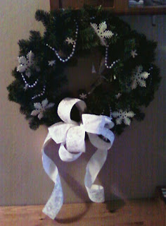 Secondly, I wanted to share with you a wreath that I helped my mom make for a contest at work. We did not win, but I think it's pretty cute for having only taken 10 minutes to make and using only things that I had laying around in my craft room. Though, I do apologize for the crappy picture. I've been using my camera as a phone for months, so I have no flash. You can barely see the ice fairy swinging in the middle...